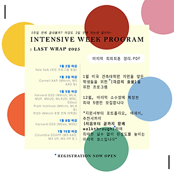 📍Intensive Week Program: Last Wrap 2025 2025년 12월, 마지막 소수정예 확장판! "최대 5명만 모집합니다" 1월 미국(또는 영국) 건축대학원 지원을 앞둔 학생들을 위한 1-2주 집중 그룹 프로그램입니다. 각 수업은 2시간 30분 동안 진행되며, 지원서부터 포트폴리오, 에세이, 추천서까지 처음부터 끝까지 함께 walkthrough하며 최대한 실수 없이 완성도를 높이는 마지막 코스입니다. Option 1 — 1 Week Course 월·화·수·목·금 (총 5일 진행) - 총 12.5시간 케어 👉 빠른 완성 / 집중 피드백 중심 Option 2 — 2 Week Course 월·화·수 / 화·목 (총 5일 진행) - 총 12.5시간 케어 👉 단계별 피드백 / 발전 과정 중심 ➡️ 두 옵션 모두 수업일수는 총 5일입니다. ➡️ 월·화·수·목·금 + 화·목(총 7일) 과정을 희망하시는 분은 이메일로 문의해주세요. 소수정예 1차·2차 학생분들에게 우선권이 주어지며, 최대 인원은 5명으로 제한됩니다. 참가비: ₩850,000 º1월 2일 마감 Yale SoA (모든 프로그램 동일) º1월 3일 마감 Cornell AAP (MArch, MS AAD 등) º1월 5일 마감 Harvard GSD (MArch, MLA, MUP, MAUD, MLAUD, MRE, DDes) Pratt Institute (MArch, MLA 등) RISD (MArch 포함 전체 대학원) º1월 7일 마감 UPenn Weitzman (대부분 프로그램 동일) º1월 8일 마감 Harvard GSD (MDes, MDE) º1월 15일 마감 Columbia GSAPP (MS AAD, MS UP, MS HP 등 MS 프로그램) *각 학교별 세부 프로그램에 따라 소폭 차이가 있을 수 있습니다. Registration Now Open — First Come, First Served. 지원 마감 전, 가장 밀도 높은 한 주! Architecture Graduate School — Final Wrap, 비욘드챕터와 함께하세요!