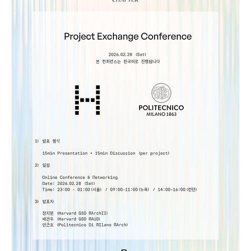 Project Exchange Conference Harvard GSD × Politecnico di Milano Beyond Chapter는 미국과 유럽을 대표하는 건축 학교 Harvard GSD와 Politecnico di Milano의 스튜디오 문화를 연결하는 온라인 컨퍼런스〈Project Exchange Conference〉를 개최합니다. 현재 각 학교에서 학업을 이어가고 있는 비욘드 챕터 멘토들이 직접 진행 중인 프로젝트를 공유하고, 프로젝트를 매개로 설계의 질문, 과정, 사고 방식을 함께 나눕니다. 완성된 결과보다 어떤 질문에서 출발했고, 어떤 선택을 거쳐 어떤 논리로 만들어졌는지에 집중하는 시간입니다. — 비욘드 챕터 맴버십 회원은 무료로 참여하실 수 있습니다. — 발표자 정지원 Harvard GSD MArch II 배건우 Harvard GSD MAUD 민근호 Politecnico Di Milano — 🗓 2026.02.28 (Sat) 🕑 London 14:00–16:00 🕘 New York 09:00–11:00 🕚 Seoul 23:00–01:00 🗣 15 min Presentation + 15 min Discussion 🌍 Online Conference & Networking & Q&A * 컨퍼런스 링크는 시작 3일 전 이메일로 전송됩니다. 이메일을 수신받지 못하셨을 시에는 이메일로 문의 부탁드립니다.
