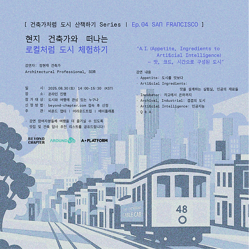 Beyond Chapter와 어라운드 트립, 에이플래폼이 함께 기획한 ‘건축가처럼 도시 산책하기’의 네번째 에피소드인 ‘샌프란시스코편’입니다. “샌프란시스코의 레이어를 해체해, 도시라는 시스템을 다시 조립합니다. ‘인공의 재료’에서 ‘인공의 지능’까지—도시는 더 이상 배경이 아니라, 주체입니다.” 음식에서 인공지능까지, 샌프란시스코는 그 자체로 살아 있는 실험실입니다. 건축가 정현재는 감각과 기억, 기술과 도시를 엮으며, 이 다층적인 도시의 얼굴을 따라 천천히 걸어갑니다. 미식에서 코드, 재난에서 재건, 실리콘밸리의 기술적 상상력과 인공지능이 도시의 리듬을 다시 쓰는 오늘에 이르기까지— 5부작으로 구성된 이 도시의 이야기는, 여행자들이 샌프란시스코를 건축가의 시선으로 다시 바라보게 할 것입니다. 📚 프로그램 구성 • Appetite: 도시를 맛보다 • Artificial Ingredients: 맛을 설계하는 실험실: 인공의 재료들 • Incubator: 차고에서 은하까지 • Archival, Industrial: 겹겹의 도시 • Artificial Intelligence: 인공지능 • Q & A 🎤 강연자 소개 정현재 건축가 (Current) Architectural Professional at SOM (Former) Intern at Zaha Hadid Architects, United Kingdom (Education) M.Arch I, Yale University, YSoA 🗓️ 행사 정보 일시: 2025년 8월 30일 (토) 오후 2:00–3:30 (KST) 형식: 온라인 강의 참가비: 1회 18,000원 (어라운드 트립 기참가자 5,000원 할인) 🌍 주최 Beyond Chapter Beyond Chapter는 건축, 조경, 인테리어 분야에서 성공적으로 커리어를 쌓아가고 있는 차세대 리더들이 모여, 지식과 경험을 공유하며 서로의 성장을 지원하는 플랫폼입니다. 더 나은 세상을 위해 노력하고, 전문성과 창의성을 바탕으로, 다음 세대를 위한 더 넓은 가능성을 함께 열어갑니다. 강연, 멘토링, 네트워킹 프로그램을 통해 전통적인 경계를 넘어, 새로운 영감과 연결을 만들어 드립니다. A-Platform 에이플래폼은 일반인과 건축가 사이 존재하던 정보의 비대칭을 해결하고, 대중이 보다 쉽게 건축을 이해하고 다가갈 수 있는 접점으로서의 건축플랫폼을 목표로 합니다. 이곳에서 우리는 사람과 정보의 연결을 통해 건축의 개념을 확장하고, 생산자와 소비자의 경계를 허물어 문화로서 건축의 새로운 가능성을 그리려합니다. Around Trip 어라운드 트립은 국내 최대 건축플랫폼을 운영하고 있는 에이플래폼의 자회사로, 건축 전문 여행사입니다. 각국 건축가들과 함께 여행을 떠나 오늘날 우리가 살아가는 공간에 다양한 화두를 던지며, 도시와 건축에 대한 이해와 감각을 확장하고자 합니다. * 참가자 전원에게 현지인만 알 수 있는 맛집 리스트와 추천 건축 답사 리스트를 송부 드립니다! * 강연 일정 및 주제는 상황에 따라 변경될 수 있습니다. * 강연 링크는 세미나 시작 2일 전 이메일로 발송됩니다. * 환불 요청은 beyond-chapter@beyond-chapter.com로 문의 부탁드립니다.