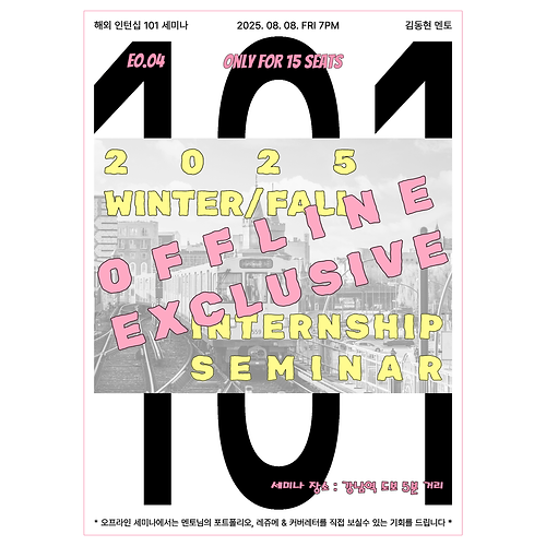 ☆101 인턴십 세미나가 16명을 위한 오프라인으로 돌아왔습니다!☆ * 참가비 안내 얼리버드 (7/11~7/28): 40,000원 일반 등록 (7/29~8/08): 60,000원 - 8월 7일 (목요일) 신청 마감 * 장소 안내 강남역 11번출구 도보 5분 거리 이번 오프라인 세미나에서는 멘토님의 포트폴리오, 레쥬메 & 커버레터를 직접 보실수 있는 기회를 드립니다! 김동현 멘토님과 직접 이야기를 하며 궁금한 점을 물어보며 대화할 수 있는 기회를 놓치지 마세요! 1. 101 세미나 "101"은 미국 대학에서 시작되었으며 기초 또는 입문 과정을 의미합니다. 일반적으로 한 학문의 가장 기본 개념, 원리, 또는 지식을 가르치는 과목에 붙습니다. 이제는 기본 정보를 제공하는 가이드나 설명서 등을 뜻하는 일반적인 표현으로도 사용되고 있습니다. 비욘드 챕터 101 세미나는 인턴십에 관한 기본적이고도 필수적으로 알아야 할 기본적인 내용을 2시간 동안 채워 전달해 드립니다. 해외 인턴십에 관심은 있으나 어디서부터 시작해야 할지 모르는 분들을 위하여 준비 하였습니다. 2. 해외 인턴십 101 세미나 안내 - 해외 인턴십은 학생 누구에게나 열려 있다는 사실을 알고 계신가요? 그리고 이러한 기회를 통해 취업의 발판을 마련한다는 사실 알고 계셨나요? - 영어가 힘들어서 어려울 것 같다구요? 언어가 다른 동유럽 학생들도, 중국 학생들도 해외에 진출하여 인턴십 경험을 쌓고 있습니다. - 비자가 걱정되신다구요? 인턴십은 학생의 특권입니다. 학교에 등록되어 있으면 대부분 문제 없이 가능합니다. - 처음 하는 경험이라 두려울 것 같으시다구요? 인턴십은 보통 다른 동료 인턴들과 함께 일하게 됩니다. 대부분 처음에는 긴장하고 두려워하던 학생들도 마지막에는 떠나는 것을 아쉬워할 정도로 값진 시간을 보냅니다. 해외 인턴십은 단순한 일을 넘어, 해외 유명 사무소 또는 유학으로의 첫 발을 내딛는 커리어의 시작점이 될 수 있습니다. 지금까지 몰라서 놓치고 있었던 기회를 비욘드 챕터의 김동현 멘토가 알려 드립니다! 3. 해외 인턴십 101 세미나 내용 구성 김동현 멘토님께서 뉴욕 현지에서의 실무 경험과 티칭 경험을 바탕으로 전체적인 큰그림과 핵심적이고 전략적인 팁들을 알려 드립니다! 지금 어떤 인턴십이 열려 있나요? 어디서 확인 하나요? 영어를 잘 못해도 갈 수 있나요? 국내에서 갈 수 있나요? 유학을 하지 않아도 갈 수 있나요? 인턴십은 무엇이 도움 되나요? 어떤 어려움이 있나요? 언제 가는게 좋을가요? 기간은 어느정도 인가요? 어떤 것들이 필요한가요? 커넥션이 필요한가요? 월급은 어떻게 되나요? 가면 보통 어떤 일을 하나요? 레쥬메는 어떻게 만드는게 좋을까요? 커버레터는 무엇인가요? 좋은 포트폴리오는 어떻게 만드나요? 비자는 어떻게 되나요? 졸업생 또는 실무 경력자도 가능한가요? 유용한 정보 모음 Q&A 4. 멘토 소개: 김동현 멘토는 미국 아이비리그 중 하나인 뉴욕에 있는 Cornell University에서 건축학 석사를 전공하셨습니다. 이후, Neal Beckstedt Studio, Bade Stageberg Cox, DSGN Consulting 등의 미국 내 유명 건축사사무소에서 근무 하셨습니다. 특히, 세계적으로 저명한 SOM(Skidmore, Owings & Merrill)에서 Senior Architectural Professional로 근무하며 건축가로서의 경력을 이어갔습니다. 현재는 여러 건축상을 수상한 Cass Calder Smith Architecture + Interiors 에서 Senior Designer로 활동 중입니다. 주요 티칭 경력으로는 뉴저지에 위치한 NJIT Hiller College of Architecture and Design에서 강의를 진행하셨습니다. 특히, 세계적인 명문 Parsons School of Design에서 인테리어 학과 포트폴리오 수업을 담당하며 학생들의 커리어를 도와주는 활동을 하였습니다. 5. 김동현 멘토 프로필: (현) Senior Designer at Cass Calder Smith Architecture + Interiors (전) Adjunct Faculty at NJIT Hiller College of Architecture and Design Part-Time Faculty at Parsons School of Design [Interior Design AAS] Project Manager at DSGN Consulting Senior Architectural Professional at Skidmore, Owings & Merrill Project Designer at Bade Stageberg Cox Designer at Neal Beckstedt Studio Master of Architecture, Cornell University * 정확한 장소는 세미나 2일 전 이메일로 전달됩니다.
